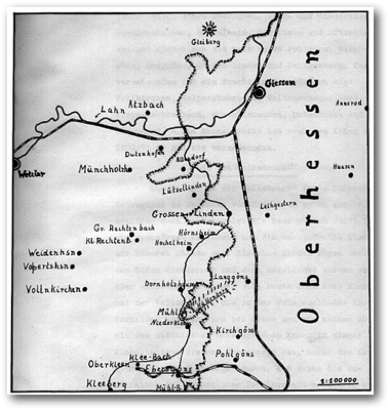 In früherer Zeit soll diese Anhöhe (heute Wehrholz) ein natürlicher Befestigungswall der Katten gewesen sein; hier mögen wohl die Hut- und Wachthütten gestanden haben, so daß sein Name ein berechtigter ist. Auch eine Thingstätte war auf dem heute bewaldeten Höhenrücken. Das Amt Hüttenberg gehörte dem Grafen von Gleiberg und umfaßte folgende 14 Dörfer (1; 1. Band 84): Allendorf, Annerod, Hausen, Langgöns, Leihgestern, Kirchgöns, Pohlgöns, Dornholzhausen, Dutenhofen, Groß-Rechtenbach, Hochelheim, Hörnsheim, Lützellinden und Niederkleen.