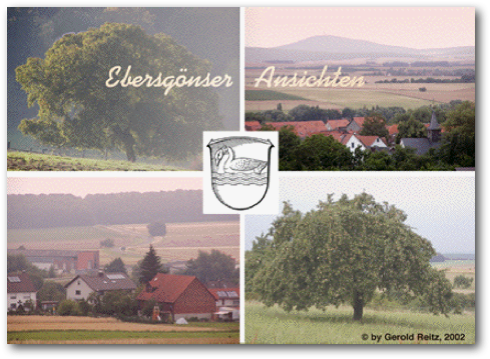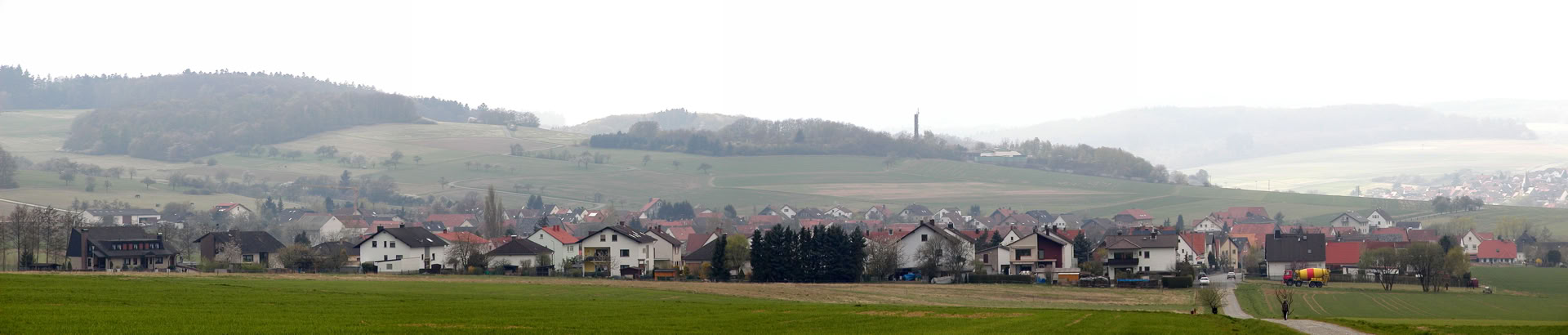 Panoramaaufnahme - Blick über den Ort in Richtung Heinrichsberg (Mitte) und Oberkleen (rechts)